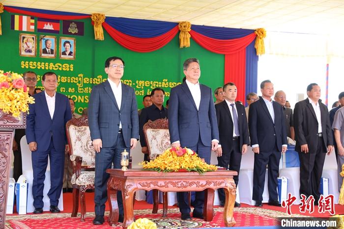 中國(guó)駐柬埔寨大使王文天、柬公共工程與運(yùn)輸部大臣賓波尼及超2000名企業(yè)代表和當(dāng)?shù)孛癖妳⒓討c典活動(dòng)。