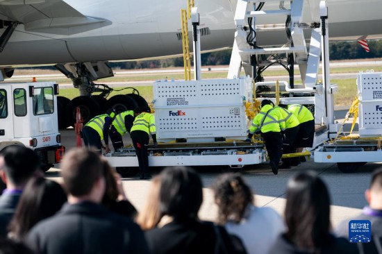 11月8日,在美國弗吉尼亞州的華盛頓杜勒斯國際機(jī)場,裝有大熊貓的特制“旅行包廂”準(zhǔn)備運(yùn)上專機(jī)。新華社記者劉杰攝