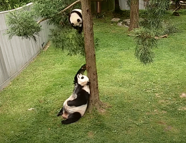 資料圖:“小奇跡”和“美香”在樹邊玩耍。來源:美國(guó)國(guó)家動(dòng)物園社交媒體
