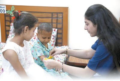 考慮到兒童病患的特殊性,“小家”一直將孩子們的心理疏導(dǎo)作為志愿工作的重點(diǎn)?!昂⒆觽兊男睦頎顟B(tài)很重要?!薄靶〖摇卑头截?fù)責(zé)人蘇比婭·阿德南說(shuō)。阿德南有30多年的兒童公益服務(wù)經(jīng)歷,在她和巴中兩國(guó)同事的引導(dǎo)下,孩子們相互鼓勵(lì)支持,在閑暇時(shí)制作各種手工藝品布置“小家”。