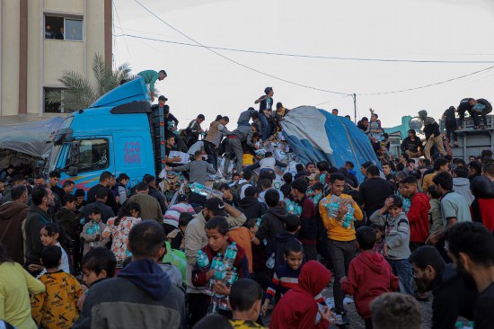 11月21日,在加沙地帶南部城市汗尤尼斯,民眾領(lǐng)取飲用水。新華社發(fā)(里澤克·阿卜杜勒賈瓦德攝)