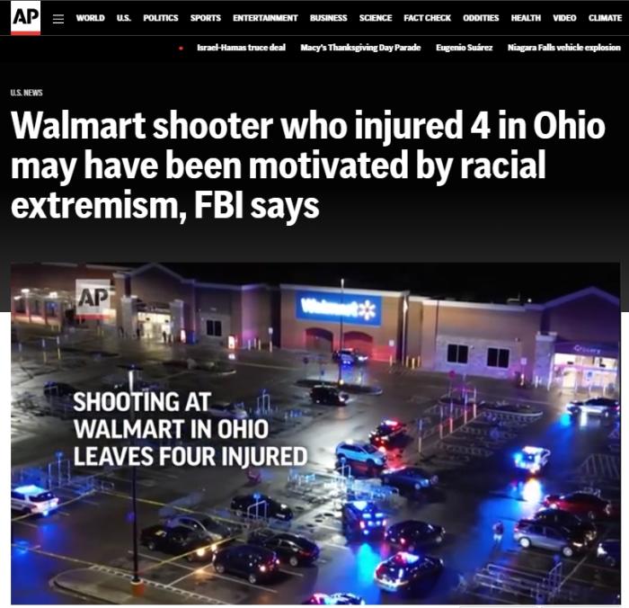 中新網11月23日電 據(jù)美聯(lián)社報道,美國聯(lián)邦調查局(FBI)當?shù)貢r間22日表示,一名白人槍手在美國俄亥俄州一家沃爾瑪內開槍,造成四人受傷,隨后自殺。FBI表示,該槍手的動機可能是極端種族主義。