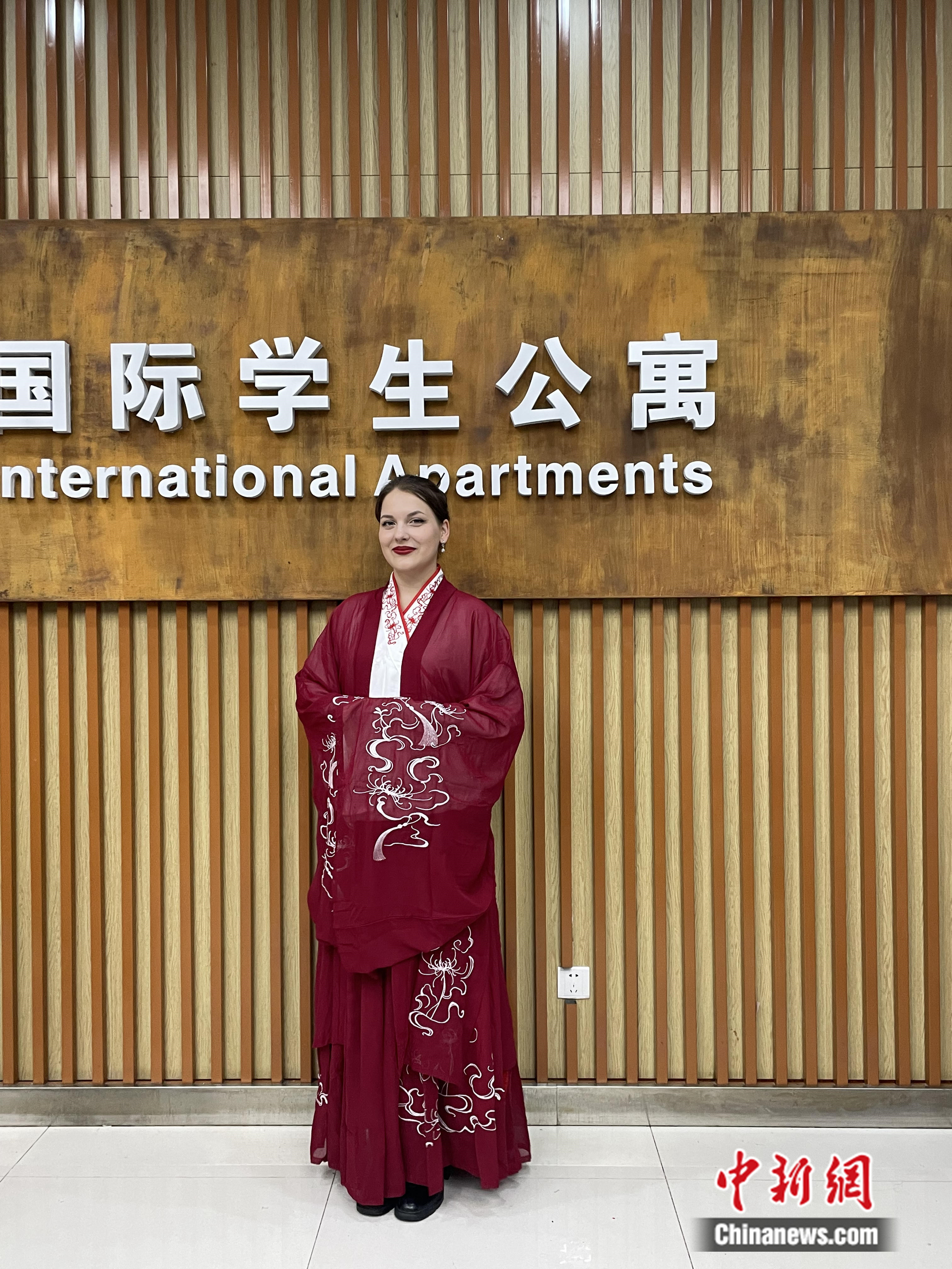 圖為欣薇在學(xué)校嘗試中國服飾。受訪者供圖