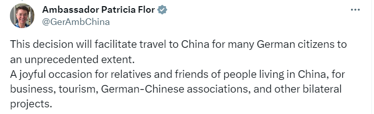 德國駐華大使傅融(Patricia Flor)在社交媒體平臺寫道:“這一決定將在前所未有的程度上為德國公民前往中國帶來便利。無論是在華的商務(wù)人士、旅游人士、德中協(xié)會以及從事其他雙邊項目的朋友,這都是一個歡樂時刻?!?/p>