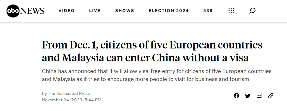 路透社報道稱,中國外交部宣布,2023年12月1日至2024年11月30日期間,上述國家持普通護照人員來華經(jīng)商、旅游觀光、探親訪友和過境不超過15天,可免辦簽證入境。