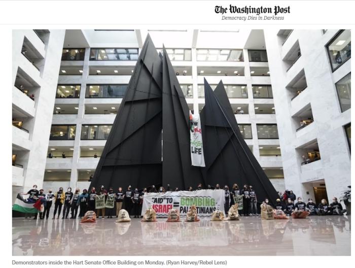 報道稱,抗議者身穿寫有“立即停止(援助)武器”字樣的黑色T恤,高喊“立即?;?!立即停火!”。他們還舉著寫有“援助以色列=轟炸巴勒斯坦人”的條幅。