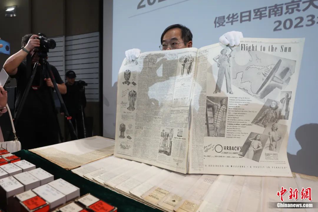 2023年12月8日,侵華日軍南京大屠殺遇難同胞紀念館舉行2023年新征文物史料新聞發(fā)布會。美籍華人魯照寧向媒體展示1937年12月6日出版的紐約時報,報紙對侵華日軍進攻南京做了詳細報道。泱波 攝