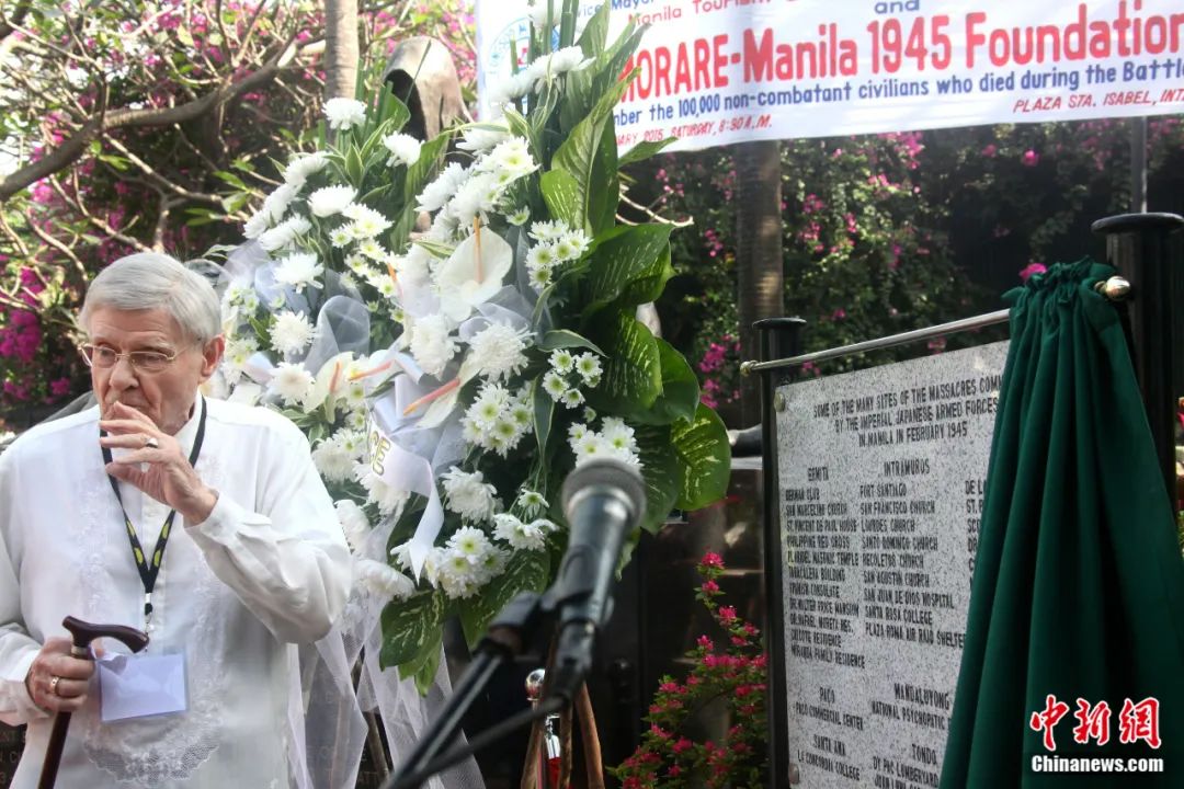 2015年2月14日,菲律賓“銘記馬尼拉1945基金會”在馬尼拉舉辦活動,紀念馬尼拉戰(zhàn)役70周年。圖為與會人士揭開記載日軍在馬尼拉多處實施大屠殺地點的牌匾。張明 攝
