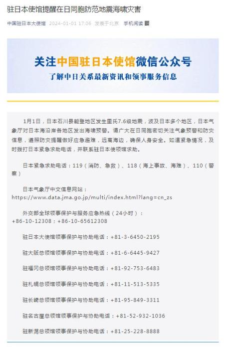 中新網(wǎng)1月1日電 據(jù)中國駐日本大使館官方公眾號消息,1月1日,日本石川縣能登地區(qū)發(fā)生里氏7.6級地震,波及日本多個地區(qū),日本氣象廳對日本海沿岸各地區(qū)發(fā)出海嘯預(yù)警。請廣大在日同胞密切關(guān)注氣象預(yù)警和防災(zāi)信息,遵照防災(zāi)提醒做好應(yīng)急避難,遠(yuǎn)離海邊,確保人身安全。如遇緊急情況,及時撥打日本緊急求助電話,并聯(lián)系駐日本使領(lǐng)館求助。