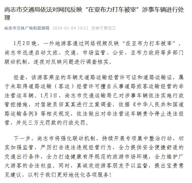經(jīng)查,該游客乘坐的車輛無(wú)道路運(yùn)輸經(jīng)營(yíng)許可證和道路運(yùn)輸證,屬于未取得道路運(yùn)輸(客運(yùn))經(jīng)營(yíng)許可擅自從事道路旅客運(yùn)輸經(jīng)營(yíng)的非法營(yíng)運(yùn)車輛。1月3日,尚志市交通運(yùn)輸局已對(duì)涉事車輛依法實(shí)施行政管控措施,對(duì)駕駛員田某某進(jìn)行立案調(diào)查,依據(jù)《中華人民共和國(guó)道路運(yùn)輸條例》等相關(guān)規(guī)定,依法做出對(duì)非法營(yíng)運(yùn)車輛責(zé)令停止違法經(jīng)營(yíng),并處三萬(wàn)元罰款的行政處罰。