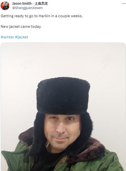 同樣對哈爾濱充滿興趣的還有美國人上官杰文。他近日在社交媒體上發(fā)布了一張自己頭戴帽子身穿大衣的照片,配文說,“準備幾周后去哈爾濱。新外套送來了。”