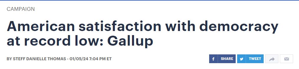 這項民調(diào)結(jié)果公布之時,正值“國會山騷亂”事件三周年之際,美國也迎來新的選舉年。《國會山報》網(wǎng)站在6日的報道中再次提到,目前美國出現(xiàn)了一系列與民主狀況有關(guān)的令人不安的跡象。