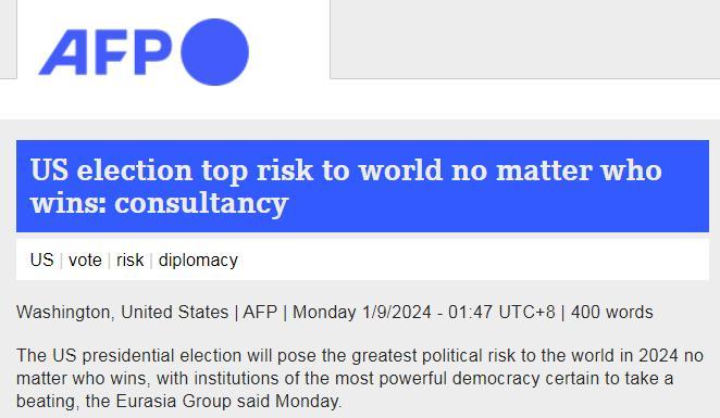 中新網(wǎng)1月10日電 據(jù)法新社報(bào)道,日前,政治風(fēng)險(xiǎn)咨詢(xún)公司歐亞集團(tuán)表示,無(wú)論誰(shuí)獲勝,2024年美國(guó)總統(tǒng)選舉都將給世界帶來(lái)最大政治風(fēng)險(xiǎn),美國(guó)制度將會(huì)受到打擊。