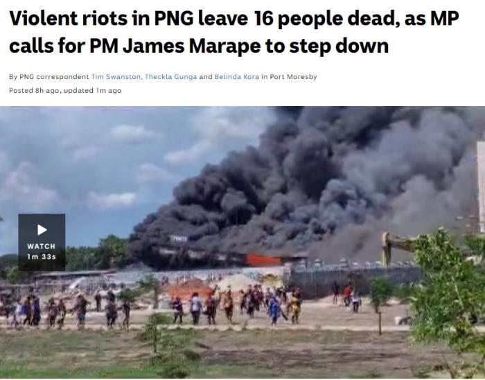 據(jù)澳大利亞廣播公司(ABC)報(bào)道,當(dāng)天,巴新部分民眾利用警察罷工的機(jī)會(huì)縱火焚燒商店和企業(yè)設(shè)施,目前騷亂已造成16人遇難,其中首都莫爾斯比港有9人死亡,第二大城市萊城則有7人死亡。