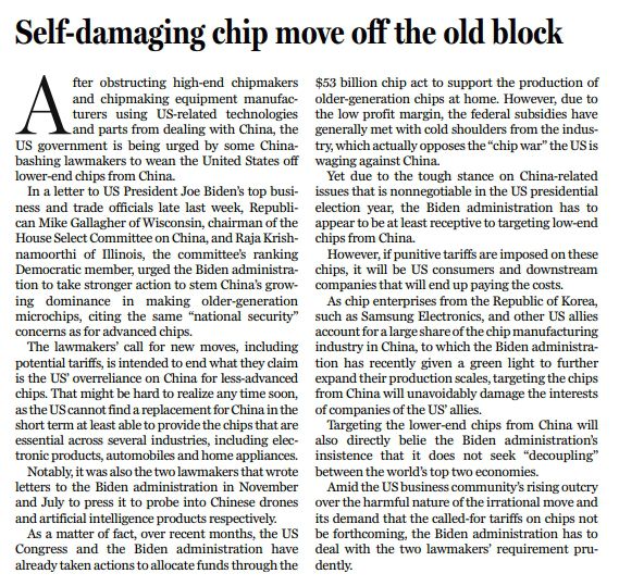 上周晚些時(shí)候,美國(guó)國(guó)會(huì)眾議院“中國(guó)委員會(huì)”主席、威斯康星州共和黨眾議員邁克·加拉格爾,以及該委員會(huì)民主黨籍領(lǐng)袖、來(lái)自伊利諾伊州的拉賈·克里希納莫西,共同向拜登政府的高級(jí)商業(yè)和貿(mào)易官員致信,敦促拜登政府采取強(qiáng)硬措施,阻撓中國(guó)在成熟制程芯片領(lǐng)域占據(jù)主導(dǎo)地位,并稱(chēng)與高端芯片一樣,在成熟制程芯片領(lǐng)域,中國(guó)同樣威脅了美國(guó)的“國(guó)家安全”。