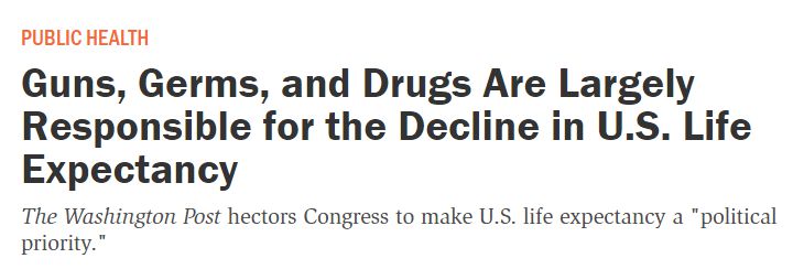 中國(guó)日?qǐng)?bào)網(wǎng)1月10日電 美國(guó)《理性》雜志(Reason)網(wǎng)站8日援引《華盛頓郵報(bào)》的文章稱(chēng),美國(guó)正面臨一場(chǎng)“壽命危機(jī)”,人口平均預(yù)期壽命在過(guò)去十年左右的時(shí)間里持平后呈下降趨勢(shì),而槍支、毒品等是導(dǎo)致危機(jī)的主要原因。
