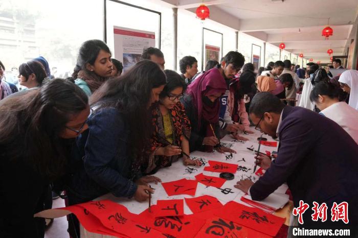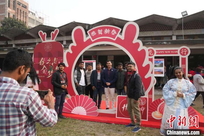 此次活動,受到達卡大學師生及當?shù)孛癖姷臍g迎。數(shù)百份“福”字、春聯(lián)、年畫、中國結(jié)、燈籠,營造濃濃的節(jié)日氛圍;近3000人次學生體驗寫福字、穿漢服等傳統(tǒng)文化;精彩的舞獅表演贏得陣陣喝彩;“恭賀新春”打卡區(qū)更是排起長龍……