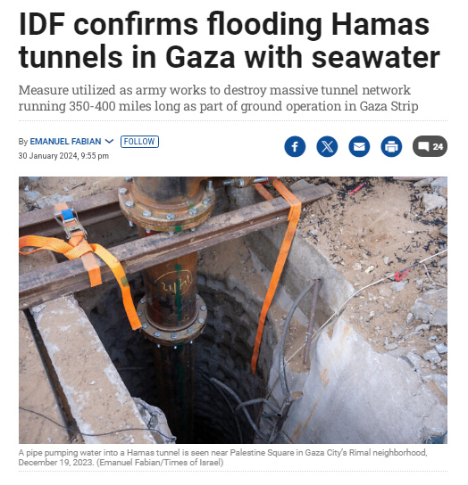 據(jù)報(bào)道,以軍在一份聲明中表示,以部隊(duì)和國(guó)防部官員共同開發(fā)了“幾種在加沙地帶向哈馬斯地下隧道注入高流量水的工具”,并補(bǔ)充說,這是“以軍用于處理(哈馬斯)地道的各類工具之一”。