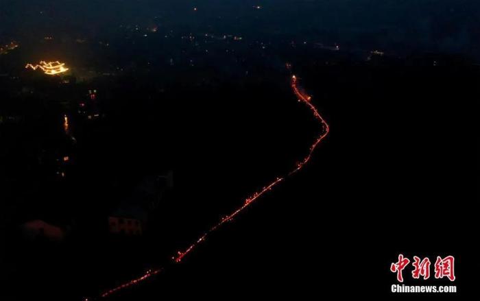 400余條板凳燈連接而成的近800米長(zhǎng)的梅燭龍燈繞村游走,夜色中猶如一條巨龍。陳斌 攝