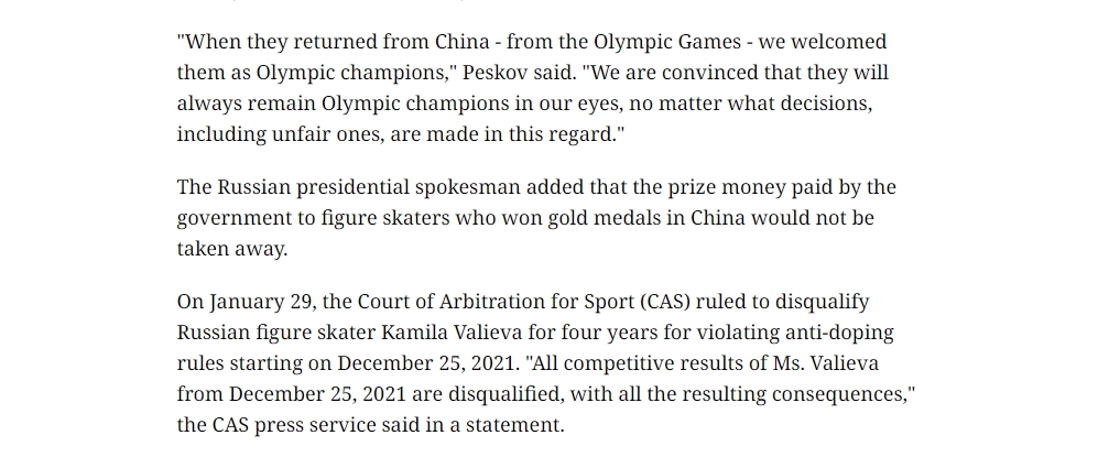 據(jù)塔斯社報道,佩斯科夫表示,無論國際體育組織作出什么決定,俄羅斯人會永遠(yuǎn)將卡米拉·瓦利耶娃和其他花樣滑冰運(yùn)動員視為冬奧冠軍。