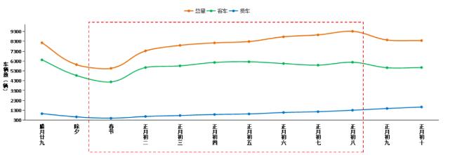 預計春節(jié)期間全國高速公路客車日均流量約4890萬輛,小客車占客車比例預計達99%以上。貨車流量在春節(jié)節(jié)前逐日下降,在正月初一達到最低值,春節(jié)假期之后逐漸恢復到日常水平,但貨車流量同比去年預計有所增長。