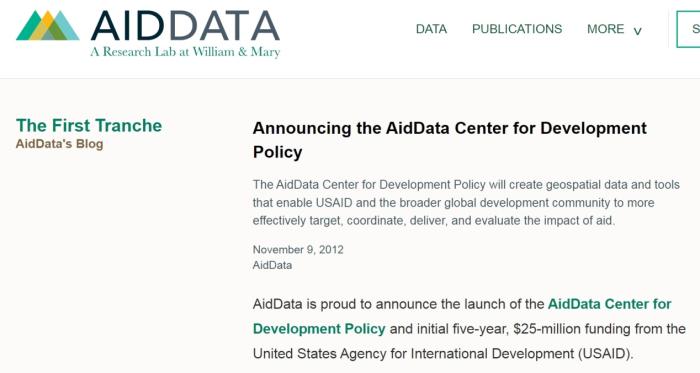 “援助數(shù)據(jù)”項(xiàng)目(AidData)官網(wǎng)上關(guān)于接受美國(guó)國(guó)際開(kāi)發(fā)署最初5年2500萬(wàn)美元資助的說(shuō)明。