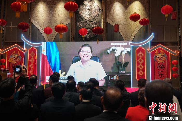 2月2日,中國駐菲律賓大使館在馬尼拉舉辦龍年新春招待會。圖為菲律賓副總統(tǒng)莎拉視頻致辭。中新社記者 張興龍 攝