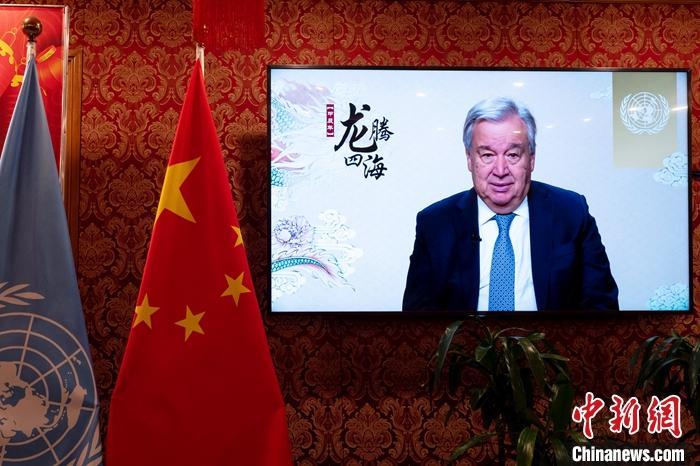 當?shù)貢r間2月6日,聯(lián)合國秘書長古特雷斯通過視頻發(fā)表新春致辭,向中國人民和全球華人致以農(nóng)歷甲辰龍年的祝福和問候。圖為中國常駐聯(lián)合國代表團紐約駐地的屏幕播放致辭。 中新社記者 王帆 攝