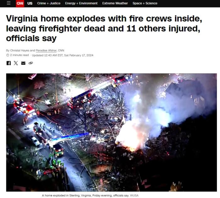 中新網(wǎng)2月17日電 綜合美媒報道,當(dāng)?shù)貢r間16日,美國弗吉尼亞州一所房屋發(fā)生爆炸,已致1名消防員死亡,另有11人受傷,其中包括9名消防員。