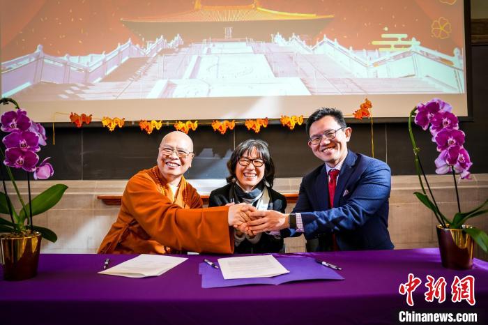 當(dāng)?shù)貢r間2月14日,加拿大多倫多,多倫多大學(xué)維多利亞大學(xué)首席行政官Ken Chan(右一),以馬內(nèi)利宗教學(xué)院院長HyeRan Kim-Cragg(中)與加拿大佛教會會長達(dá)義大和尚共同簽署加拿大佛學(xué)院合作備忘錄?!?加拿大佛教會供圖)
