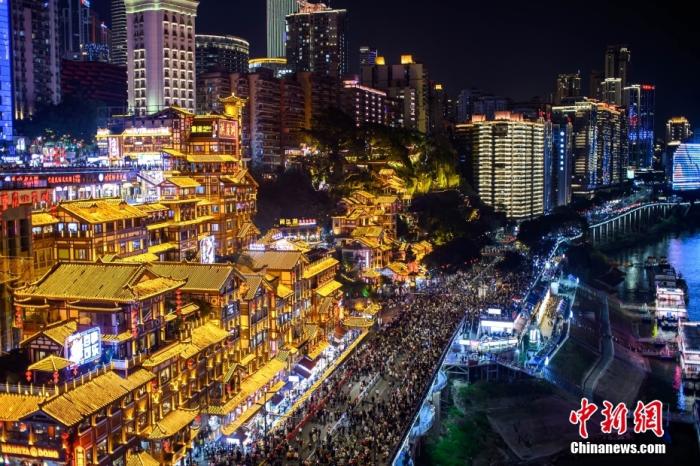 2月16日晚,重慶洪崖洞游人如織。中新社記者 何蓬磊 攝