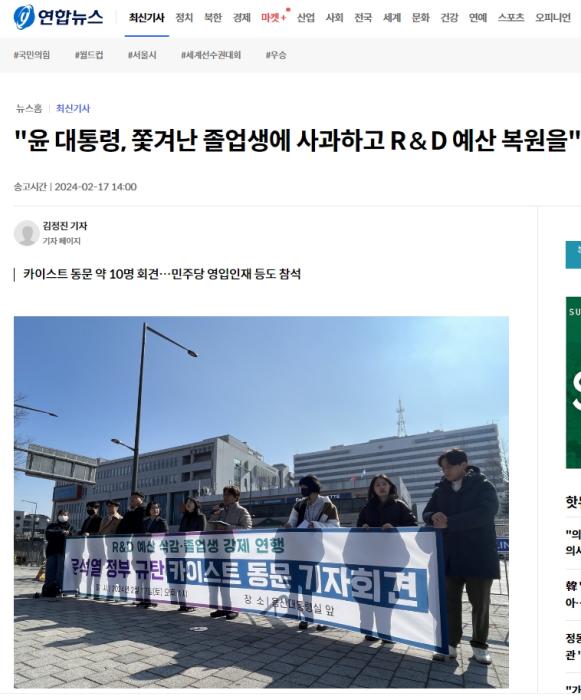 17日,韓國科學(xué)技術(shù)研究院的校友在龍山總統(tǒng)府前舉行記者會(huì),他們表示:“尹錫悅總統(tǒng)毫不留情地堵住畢業(yè)生的嘴,并將其趕了出去,對(duì)此我們感到非常憤怒。”他們要求尹錫悅道歉,并恢復(fù)削減的研究與開發(fā)預(yù)算。