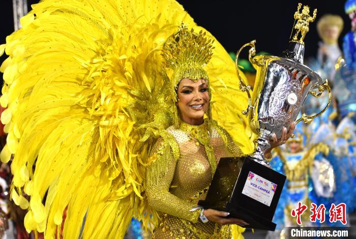 當(dāng)?shù)貢r間2月17日晚間,巴西圣保羅狂歡節(jié)冠軍隊(duì)重返桑巴大道做收官游行演出。圖為一名桑巴舞校演員展示獎杯。記者林春茵攝
