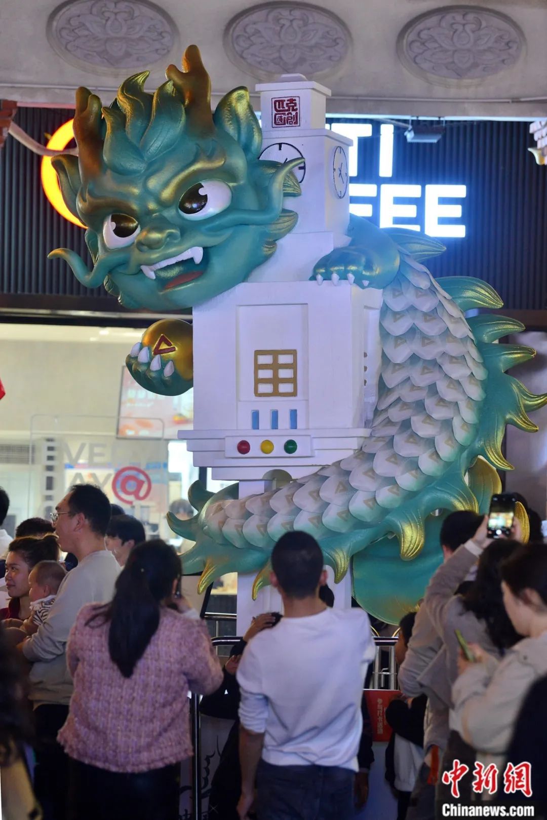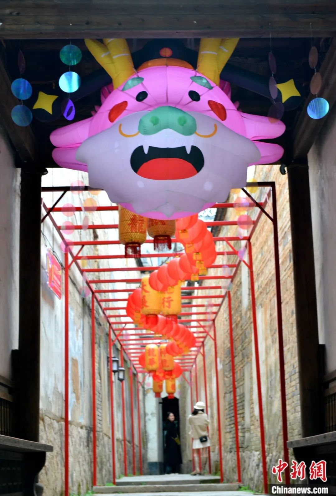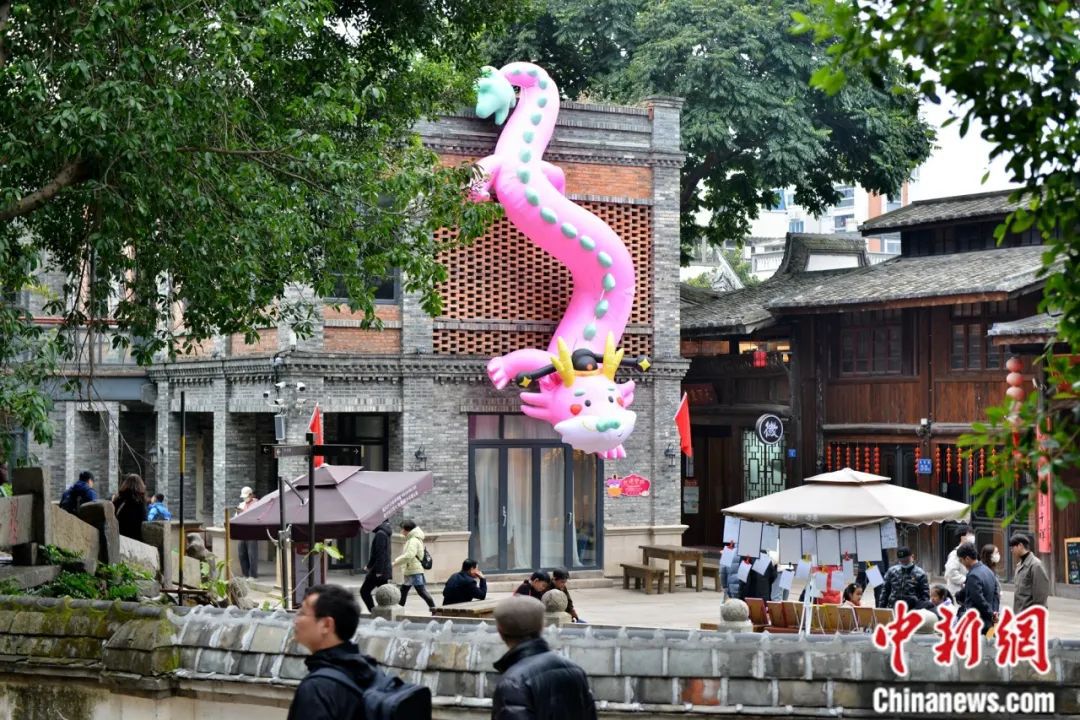 “龍?jiān)亍彼囆g(shù)主題裝置亮相福州上下杭?xì)v史文化街區(qū),活潑的造型與古厝形成鮮明對比。中新社記者 呂明 攝