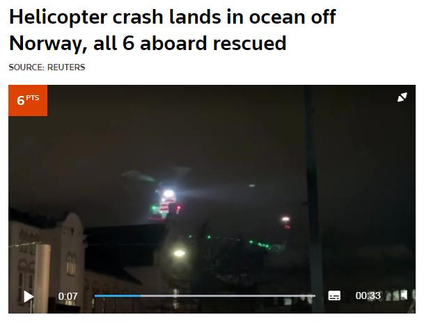 中新網(wǎng)2月29日電 據(jù)路透社報(bào)道,當(dāng)?shù)貢r(shí)間28日,挪威聯(lián)合救援協(xié)調(diào)中心稱,一架載有6人的直升機(jī)在挪威西部海岸附近海域墜毀,機(jī)上所有人員隨后被從海中救起。
