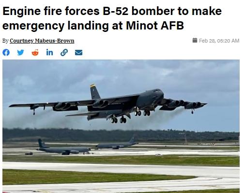 據(jù)報(bào)道,當(dāng)天,美國邁諾特空軍基地發(fā)言人稱,當(dāng)?shù)貢r(shí)間23日,一架B-52H型戰(zhàn)略轟炸機(jī)從該基地起飛,一臺(tái)發(fā)動(dòng)機(jī)在空中起火,隨后被迫緊急降落該基地。報(bào)道稱,飛機(jī)著陸后,火被撲滅,機(jī)組人員沒有傷亡。
