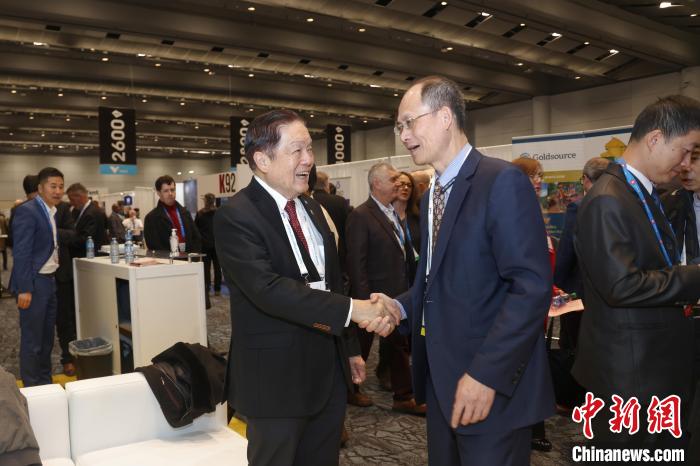 當(dāng)?shù)貢r間3月3日,2024年加拿大國際礦業(yè)大會(PDAC)在多倫多揭幕。圖為加拿大聯(lián)邦參議員胡子修(左)與參展中國企業(yè)紫金礦業(yè)集團(tuán)股份有限公司副總裁沈紹陽交流。中新社記者 余瑞冬 攝