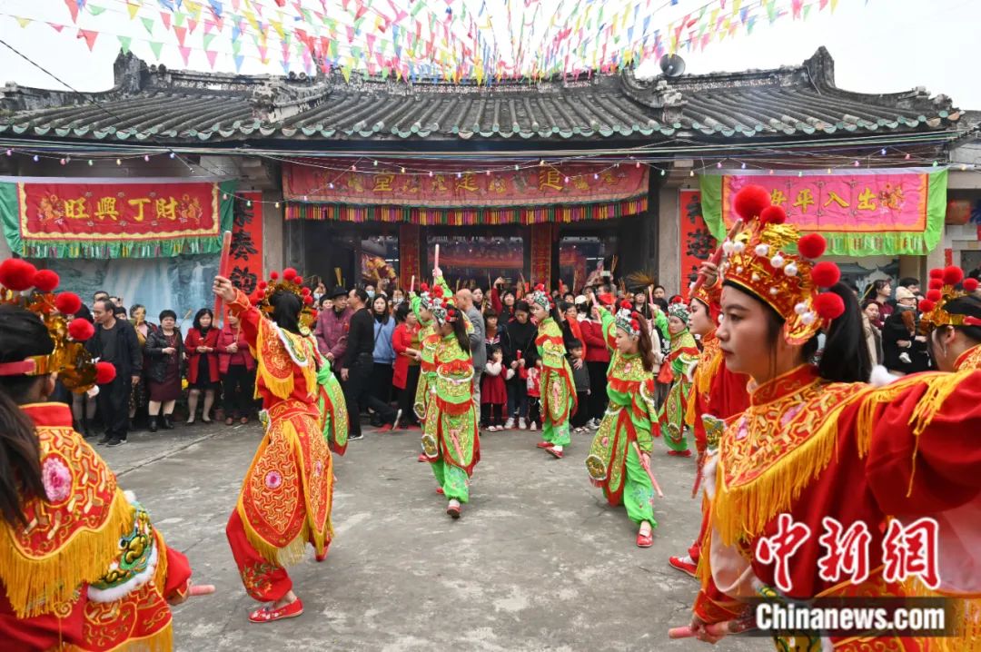 2023年2月9日,廣東潮州,潮陽西門女子英歌隊亮相仙都鄉(xiāng)媽祖文化巡游活動。陳楚紅 攝