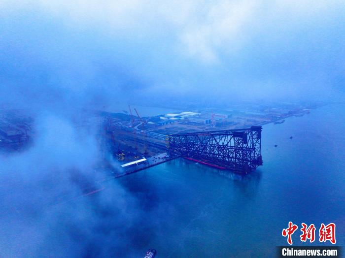 3月12日,亞洲第一深水導(dǎo)管架“?;?hào)”在廣東珠海建造完工。這是“?;?hào)”導(dǎo)管架裝船后全景。(中國(guó)海油供圖)
