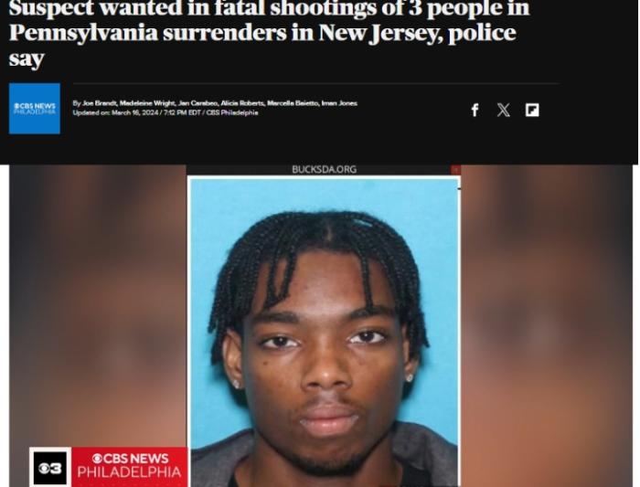 據(jù)報道,這名26歲的嫌疑人在兩處不同的住宅中殺害了3人,隨后劫持了一名司機(jī)前往新澤西州,最終在新澤西州一處住宅附近被逮捕。報道稱,這起槍擊事件的受害人包括嫌疑人的繼母和他13歲的妹妹。