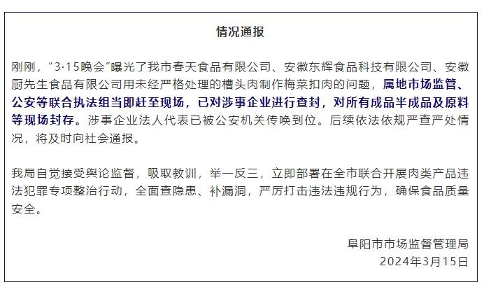 涉事企業(yè)所在的阜陽市市場監(jiān)督管理局當晚發(fā)布情況通報稱,屬地市場監(jiān)管、公安等聯(lián)合執(zhí)法組當即趕至現(xiàn)場,已對涉事企業(yè)進行查封,對所有成品半成品及原料等現(xiàn)場封存。涉事企業(yè)法人代表已被公安機關傳喚到位。后續(xù)依法依規(guī)嚴查嚴處情況,將及時向社會通報。