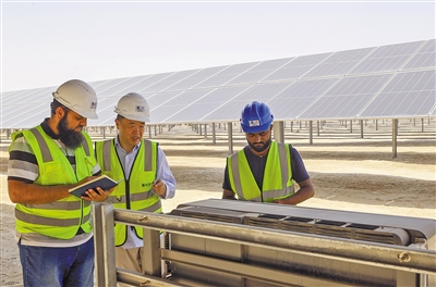 由中國(guó)企業(yè)總承包的阿聯(lián)酋艾爾達(dá)芙拉光伏電站可供20萬戶居民用電,每年減少二氧化碳排放240萬噸,使清潔能源在阿聯(lián)酋總能源結(jié)構(gòu)中的比重提高到13%以上。圖為中外員工在艾爾達(dá)芙拉光伏電站工作。