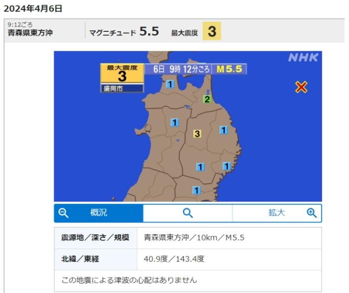 中新網(wǎng)4月6日電 據(jù)日本廣播協(xié)會(NHK)報(bào)道,當(dāng)?shù)貢r(shí)間6日9時(shí)12分,日本青森縣海域發(fā)生5.5級地震,震源深度10千米。
