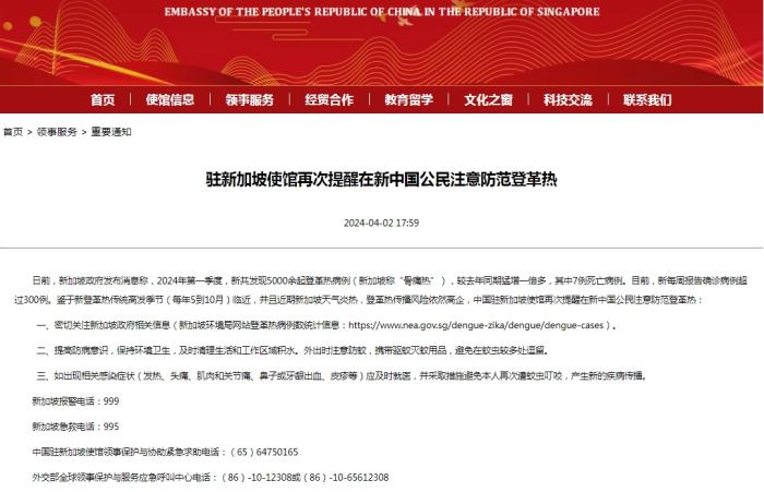 目前,新每周報告確診病例超300例,鑒于新登革熱傳統高發(fā)季節(jié)(每年5到10月)臨近,并且近期新加坡天氣炎熱,登革熱傳播風險高企,駐新加坡使館提醒在新中國公民注意防范登革熱: