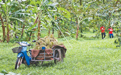 在泰國南部春蓬府的一家榴蓮種植園,工人將采摘下來的榴蓮裝到車上準備運出。
