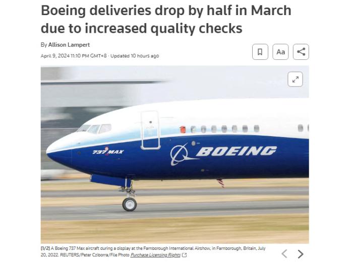 據(jù)報道,數(shù)據(jù)顯示,波音公司2024年第一季度共交付83架飛機,其中包括66架MAX噴氣式飛機。作為對比,2023年同期交付了130架飛機。