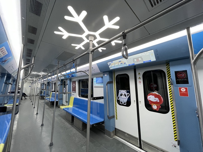 登上車(chē)廂,隨處可見(jiàn)冬奧元素。車(chē)頂?shù)臒魩Р辉賳握{(diào),而是被設(shè)計(jì)成了雪花的形狀,車(chē)廂扶手也融入了冰球桿的設(shè)計(jì)。而在車(chē)門(mén)上,北京冬奧會(huì)吉祥物“冰墩墩”和“雪容融”仿佛在和乘客們招手。