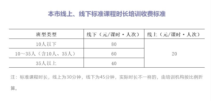 按照國家“要區(qū)分線上和線下以及不同班型,分類制定標(biāo)準(zhǔn)課程時長的基準(zhǔn)收費(fèi)標(biāo)準(zhǔn)”的要求,根據(jù)國家規(guī)定的主要定價班型,確定了本市線上、線下學(xué)科類校外培訓(xùn)的基準(zhǔn)收費(fèi)標(biāo)準(zhǔn)和浮動幅度。