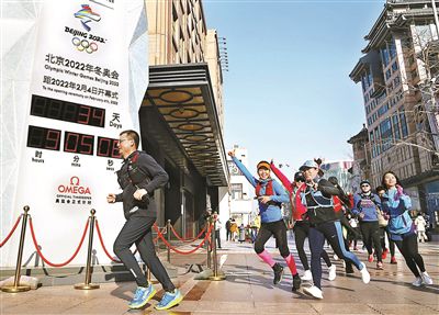 昨天,在位于王府井百貨大樓前的北京2022冬奧會(huì)倒計(jì)時(shí)牌前,除了拍照外,市民還通過各種“個(gè)性打卡”方式慶祝新年的到來。圖為前來“打卡”的清華MBA健跑俱樂部的隊(duì)友們從倒計(jì)時(shí)牌前跑過。
