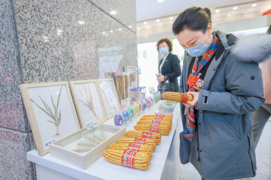 1月6日,代表會前參觀種子包衣成品展臺。 本報記者 潘之望攝